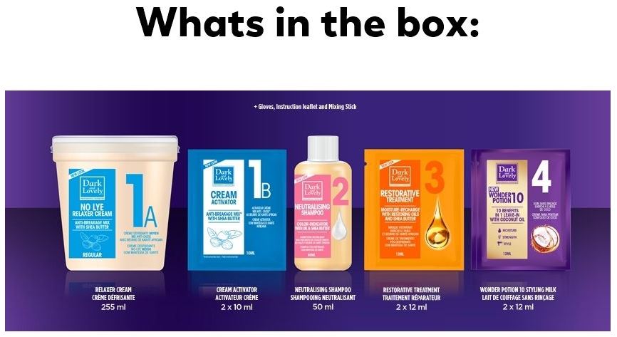 Trust one of the leading relaxer kit brands in Africa approved by African hairstylists. This Dark and Lovely Superior Moisture Plus No Lye Relaxer Kit Regular is expertly formulated to deliver silky, shiny, straight hair. Its oil-infused formula is enriched with nourishing African Shea Butter and relaxes your hair with 60% less breakage*. Dark and Lovely Superior Moisture Plus No Lye Relaxer Kit Regular provides intense nourishment and shine for healthy-looking hair.